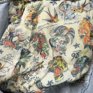 Ed Hardy Fit & Flare jeans featuring iconic tattoo-inspired artwork. Front leg features a dagger with rose design and 'Love Eternal' text. Back showcases large Ed Hardy signature logo in gold embroidery with additional tattoo art motifs. Medium wash denim with slight fading. Classic 5-pocket styling. Flared leg silhouette. Excellent condition with vibrant embroidery and graphics intact. Material composition: 70% Cotton, 22% Polyester, 7% Rayon, 1% Spandex for comfortable stretch.