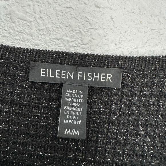 Eileen Fisher Waffle Knit Top Medium Black Metallic Merino Wool Blend Festive