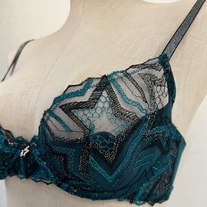 Discover elegance with this beautifully designed lace bra. Featuring a stunning teal and black color combination, this piece offers both style and comfort. Perfect for adding a touch of sophistication to your intimate collection.