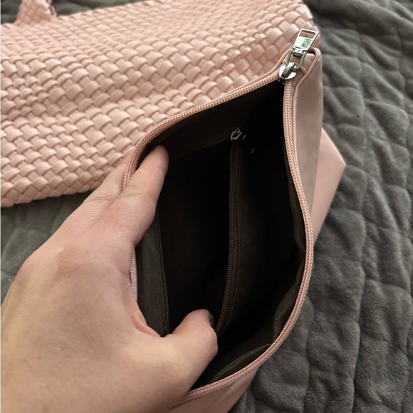 This elegant pink woven tote bag is perfect for any occasion. Its stylish design and spacious interior make it a must-have accessory. Add a touch of sophistication to your outfit with this beautiful bag.