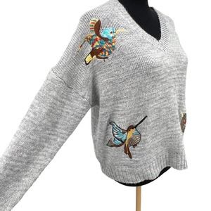 Elia-Cher Grey V Neck Knitted Embroidered Bird Sweater S/M