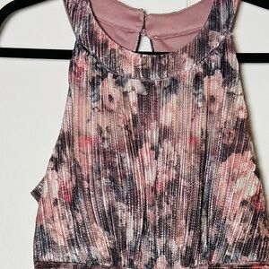 Elegant floral maxi dress by Eliza J. Features a sleeveless design with a high neckline. Pleated skirt with a side slit. Perfect for formal occasions.