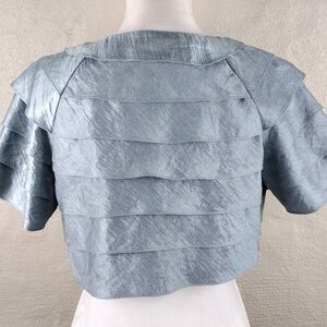 Eliza J. New York Women's Silver Peter Pan Ruffle Layered Short Sleeve One Clasp Open Front Dress Bolero Jacket. 71% Rayon, 18%. Lining: 100% Polyester. Measurements approx. Flat Lay. Pit to Pit: 18, Sleeves: 11.5, Length: 14. Size 12P. Two Piece Set. Only Jacket.