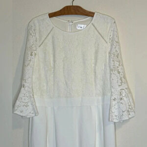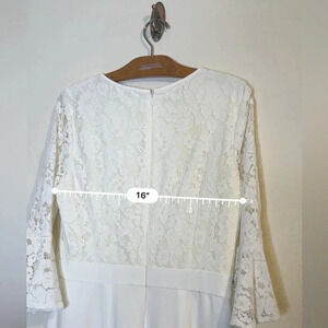 featuring a classic scoop neckline, elegant sheer bell sleeves, and fitted hem. Closure: Zipper; Hook & Eye Fabric Type: Lace Care Instructions: Dry clean