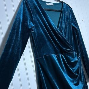 Elegant deep blue velvet dress. Features long sleeves and a chic wrap design.
