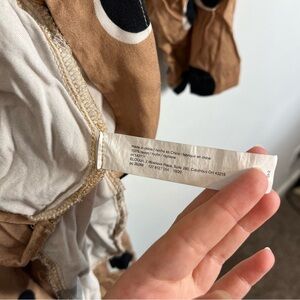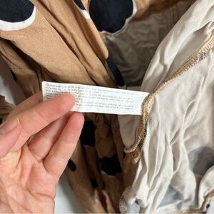 Stylish tan set with bold black polka dots. Features a belted waist and long sleeves. Perfect for a chic look.