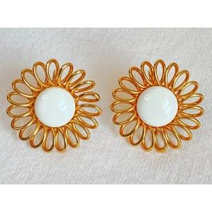 Emmons Sunflower Earrings Large Gold Tone And White Cabochon Clip on
