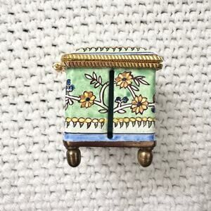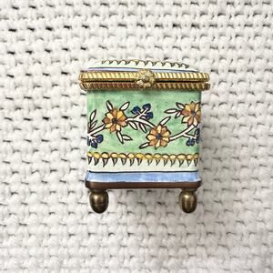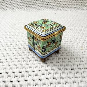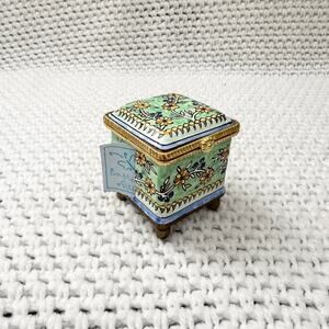 From Empress Arts. Vintage 2002. Made in USA. Blue and green hinged lid enamel and brass stamp dispenser miniature box. Preowned in good condition with no stains or tears.