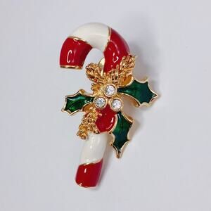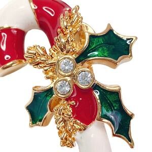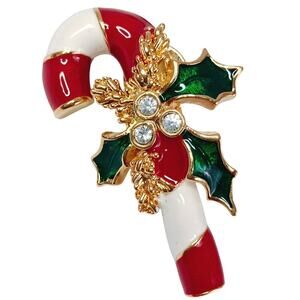 Enamel Candy Cane Christmas Pin Rhinestone Holly Festive Brooch Holiday Jewelry