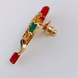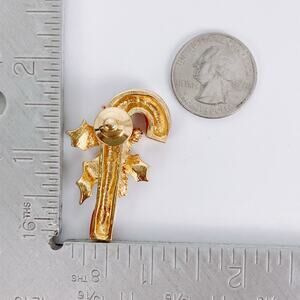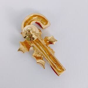 Features: Candy cane motif; red and white enamel striping; green enamel holly leaves; clear rhinestone accents; textured gold tone branches; clutch-style pin back