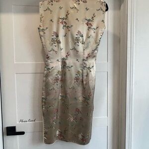 This elegant floral satin dress features a beautiful cream base with delicate floral patterns. Perfect for any special occasion, it offers a sophisticated and timeless look.