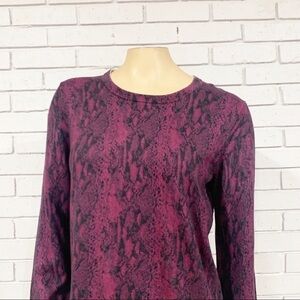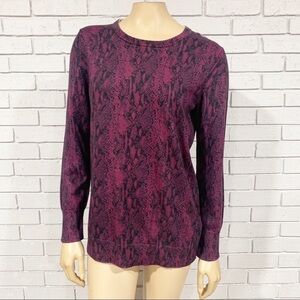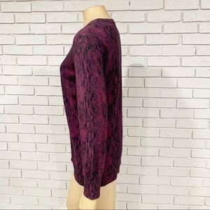 A fun snake print exterior complements this soft knit sweater. Color: Maroon Multi. 95% cotton and 5% cashmere.