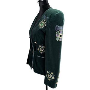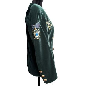 Features: Beautiful plush velour material with sewn on decorative patches. Gold buttons. 77% Cotton and 23% Rayon. Dry clean only. Made in Germany.