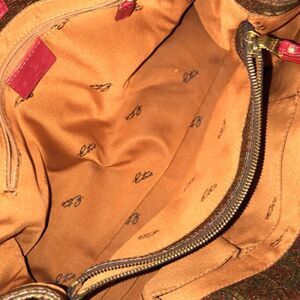 Details:  Brown coated canvas exterior, pink-red leather accents, top magnetic closure, gold-tone hardware, marigold orange fabric interior with two large compartments and zip pouch, mild usage with creasing and rubbing (no holes, tears, cracking, or smells), clean inside, made in Italy