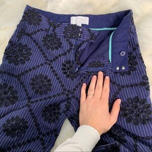 Ultra chic and trendy wide leg pants by Anthropologie brand ett:twa. Features navy blue with white pinstripes and overlying floral style embroidery. Has belt loops to add your fav belt. Great preowned condition with small area of mark as shown. Lying flat waist approx 13.5” across and inseam approx 30.5” and front rise approx 10”. All measurements are approximate