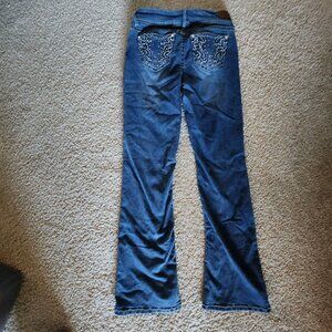 J05        Excellent Condition by Wallflower Blue Jeans, rhinestones, white stitching, high-rise two decorated back pockets and three front pockets, closure is zip & button