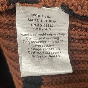 • Features: Pullover styling, Mock neck, Long sleeve, Brown knit with black stripes