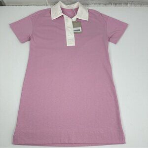 Everlane women's size small dress, it is The Organic Cotton Polo style, short sleeves, collared v-neckline, above the knee length, side slit hem, color is mauve with white trim, oversized boxy fit, stretchy, pull over no closure. Materials 100% organic cotton. Care machine wash cold tumble dry low. Condition is new with tags as shown in the pictures. Please preview the measurements to ensure fit. Size 6 dress form used in photos.