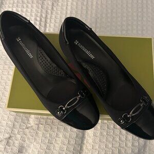These black dress shoes are the perfect compliment to any outfit. Naturalizer has created a solid reputation for providing comfort and style when it comes to footwear. These shoes are available in size 8 Medium and have built in comfort insoles for the ball of the foot and the arch. These shoes are in excellent condition and ready to enhance the statement that you are already prepared to make with your outfit and accessories.