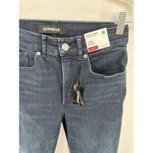 Elevate your denim game with these Express Perfect Curves Legging high-rise jeans in size 4R. The dark blue cotton blend fabric, with a solid pattern, is both stylish and comfortable, enhanced by the stretch features that ensure a perfect fit. The zip and button closure, along with the skinny style and slim fit, make these jeans suitable for any occasion.