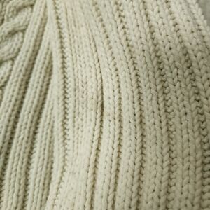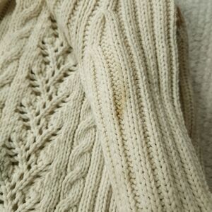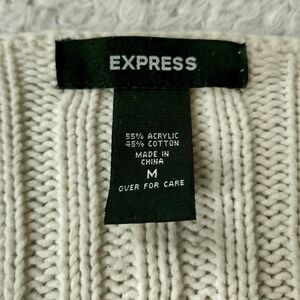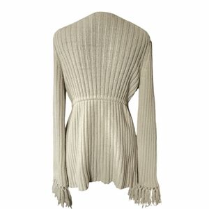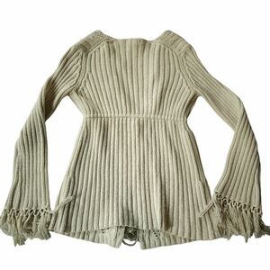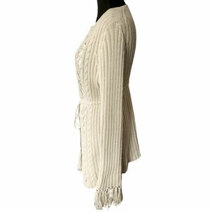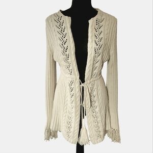 Express sz M Fringe Knit Open Front Sweater Cardigan. Cream/off white color, fringe cuffs and tassels on the ties. Ribbed and open Knit design. Couple stains on the one sleeve (pics). Flat measurements approximately