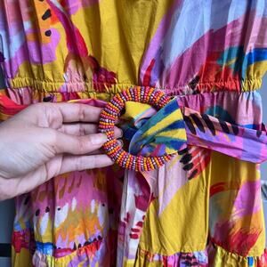 FARM Rio Neon Macaws puff sleeve cotton maxi dress. Gorgeous yellow and multicolored tropical resortwear macaw motif. Easy fit, off the shoulder neckline with elastic. Center front beaded button placket. Detachable belt with beaded tassel. Belt loops. Elastic at waist. Long tiered ruffled skirt. In excellent condition. Size XS - 16.5 pit to pit; 12.5 waist at smallest; 47" total length.