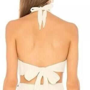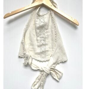Details: Size L, Halter neck shoulder straps. Adjustable back tie closure, with cutout lace in the middle, gauze like straps