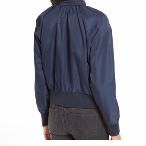 FREE PEOPLE MIDNIGHT BLUE BOMBER JACKET! Zip closure . Snap buttons. Silver accents! Satin! It’s such a great piece!! Impeccable quality’ excellent condition!!! S