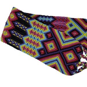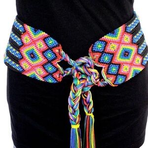 Handmade using traditional Maya weaving techniques, this FTWWL (From The World With Love) belt adds a vibrant, ethnic-inspired touch to any outfit. Designed with vivid pink, blue, yellow, purple, red, and black threads, the wide woven band is finished with fringe tassel ties for an adjustable fit. Perfect for cinching dresses, tunics, or layering over outerwear.