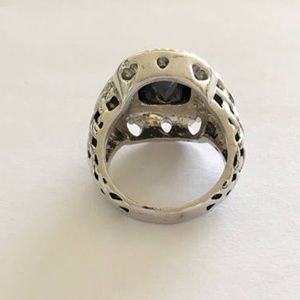 This faceted ring is made up of an onyx gem stone and two triangle super clear CZ on the sides is set in a sterling silver plate. It has a beauty gold colored rope designed around the center stone. The basket weave band design makes this ring a must have! There's also super sweet hearts around the center stone on the sides. This ring is available in size 7 & 8.