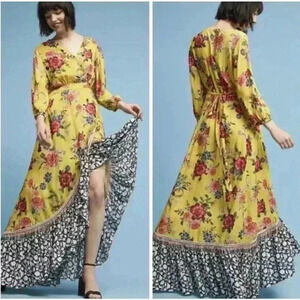 Farm Rio Maxi Dress XS Floral Yellow Pink Wrap Anthropologie Midi Asymmetrical
