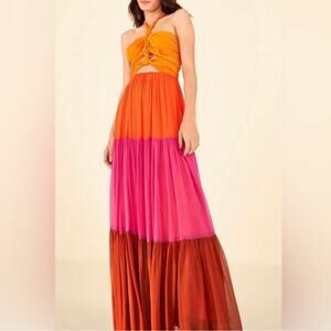 Farm Rio Women’s Color Block Orange Pink Halter Tie Cutout Bust Maxi Dress Small