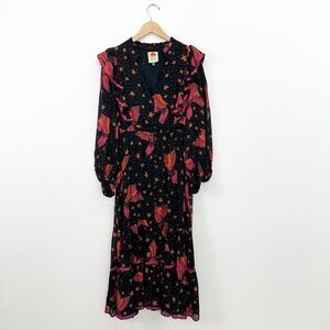 Farm Rio Women’s ASOT Black Pink Macaw Bird Orange Stars 3D Star Buttons Midi Dress