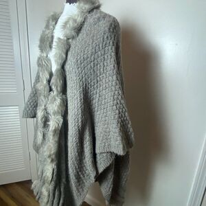 Faux Fur Trimmed Gray Knit Shawl Cardigan Open Front Cozy Cape Wrap One Size
