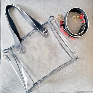 The perfect tote for sporting events at exactly the largest size compliant at U.S. stadiums. Navy Italian leather trim, custom French hardware, and thick PVC perforated for breathability. It won't sweat, warp or lose its structure. Customized w red accents and a longhorn logo.