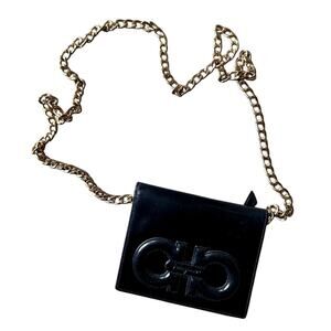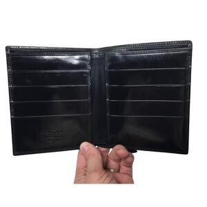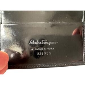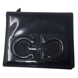 Salvatore Ferragamo bifold wallet. Enamel Black. Double Gancini. 2 slip pockets, numerous card slots, small zippered coin semi-pocket on back. Compact, yet sleek and stylish.
