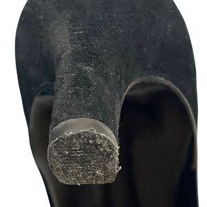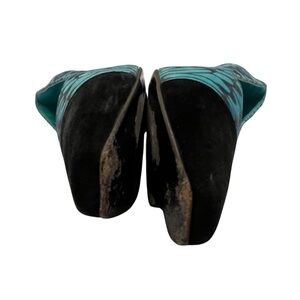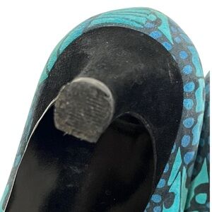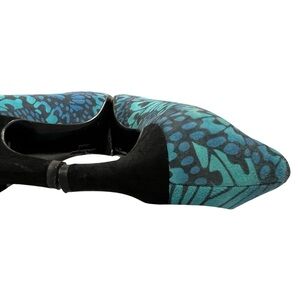 These Ferragamo heels are stunning and super unique! The butterfly-wing-inspired print in shades of teal and blue gives them such a vibrant, artistic feel. The black suede cap toe and low kitten heel add a classic, elegant contrast—very signature Ferragamo: sophisticated with a twist.