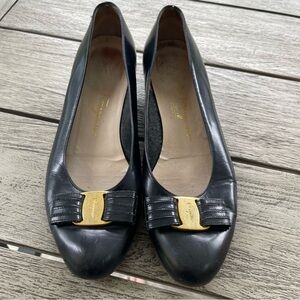 Salvatore Ferragamo Vara Bow Black Leather Low Block Heel Pumps Womens Size 7.5