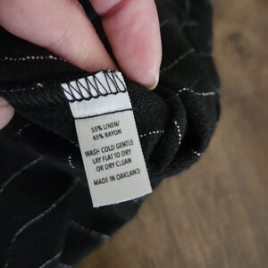 Made from a black linen / cotton fabric with a white vertical stripe that is woven in.