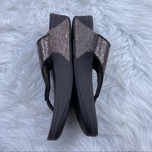 Fitflop Lulu Superglitz sandals size 9. Brown wedge flip flop sandals with better contact area for shock absorption and underfoot pressure. Thong toe with glitter synthetic and leather upper. 2” molded heel and 1” platform. Round toe and rubber soles. Minimal wear.