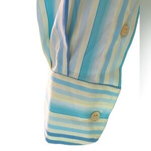 Super clean, cheerful Ted Baker striped long sleeved dress shirt in cream, sky blue, colonial blue, and mint green in awesome condition. It's 75% cotton, 21% polymide, and 4% elastic, and a size 2 measures as follows: