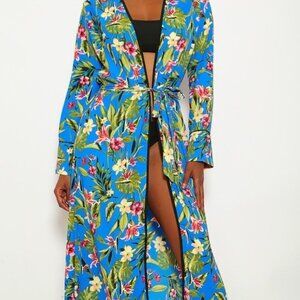 Stunning open front Duster featured in an eye catching blue background with floral print all over, can be worn open front or belted closed