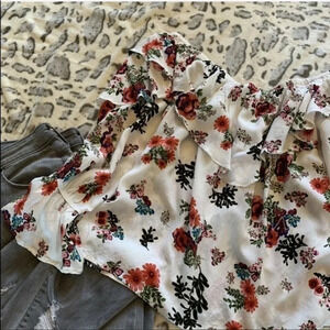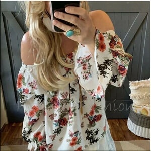 Beautiful off-the-shoulder floral top with long sleeves and ruffle detail is brand new in package. 100% Rayon. Small flat measurements 18” pit to pit, 19” total length.