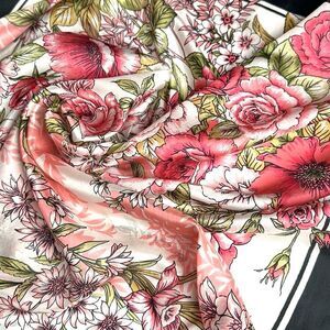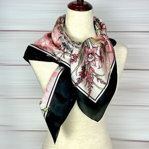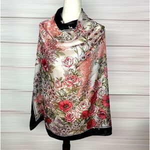 Floral Square Scarf Silky Chiffon Pink Ivory Black Trim Hand Rolled