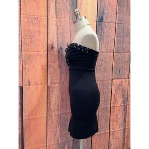 Sexy black strapless bodycon mini dress. It features a deep V-neckline with metal eyelets and a lace-up detail.