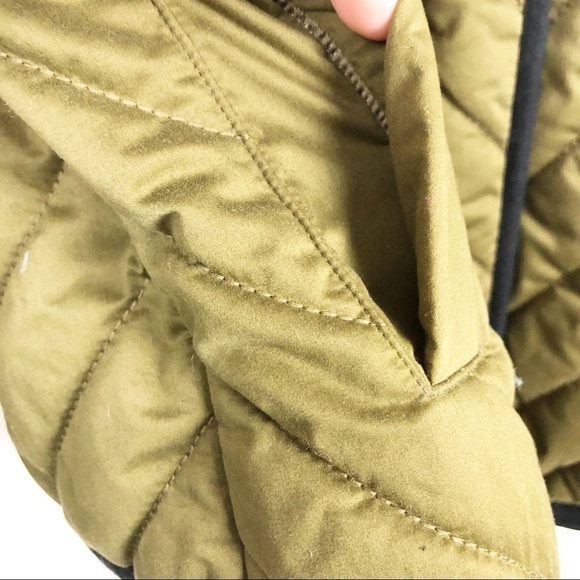 Long sleeve, asymmetrical zip closure, faux pockets, fully lined. Quilted. Khaki, tan, olive army green. Cotton, Dry clean only. Casual, trendy, neutral.