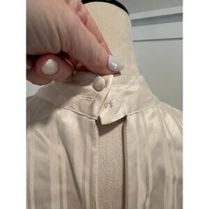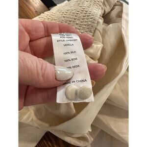100% silk. Puff sleeves. Smocking elastic detail at back waist. Color is Vanilla.