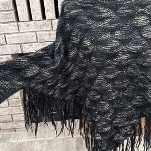 Frazzle Women's Eyelash Knit With Sleeve Fringe Poncho Sweater Black Blue Medium