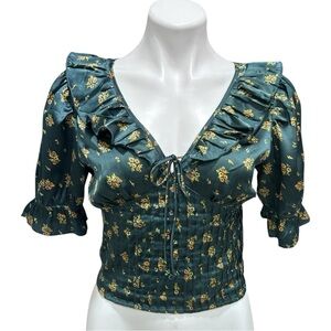 Gorgeous forest green floral print silky top featured in a corset-inspired silhouette with a plunging neckline, puffed sleeves and ruffled details.