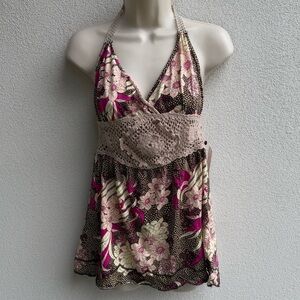 Free People Kitschy Floral Print & Crochet Halter Large